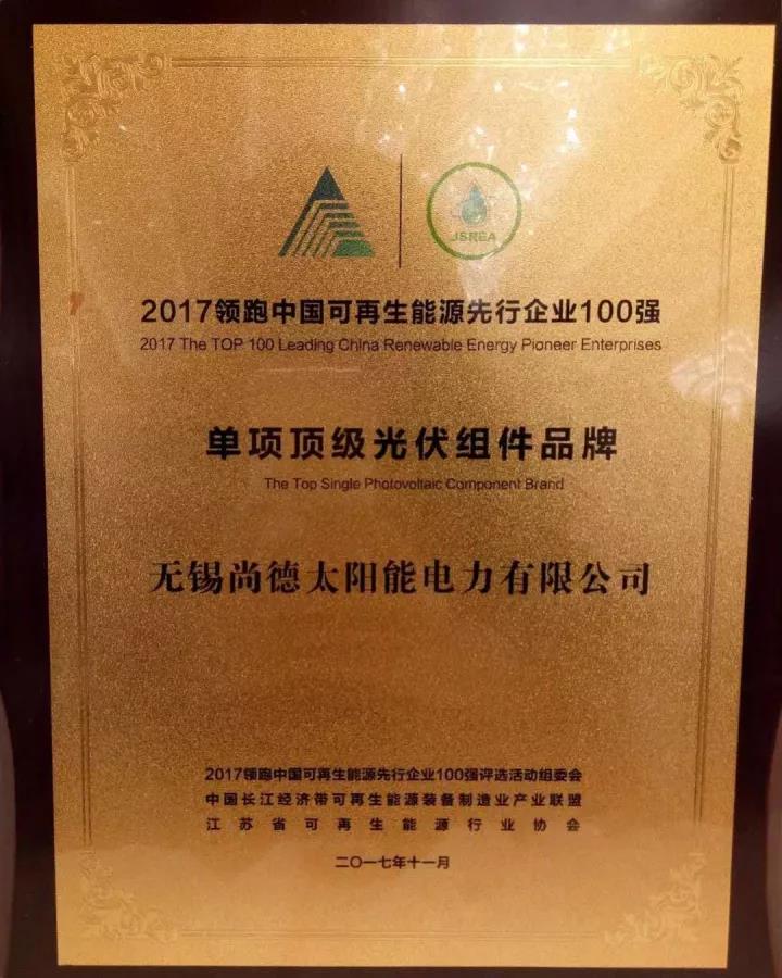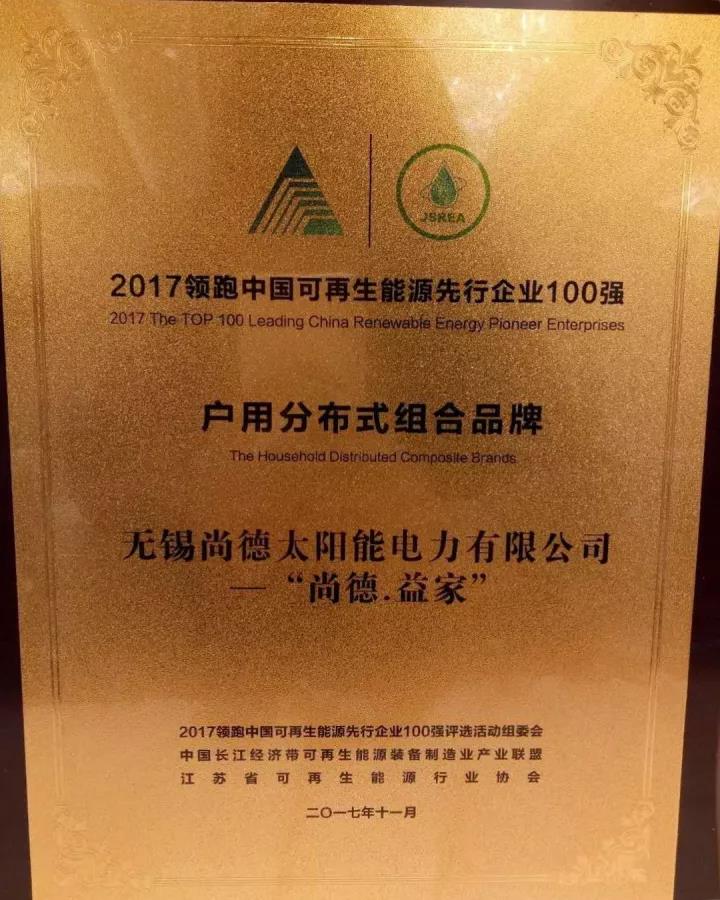 在晚上进行的颁奖环节上,无锡尚德总裁何双权先生荣获“优秀企业家”称号,无锡尚德荣获“顶级光伏组件品牌奖”称号,尚德·益家荣获“户用分布式组合品牌奖”称号,十七年的深耕细作让尚德收获了良好的业界口碑,客户的肯定是尚德继续前行的动力,我们会秉承初衷,用优质、多样化的产品全心全意服务于客户。