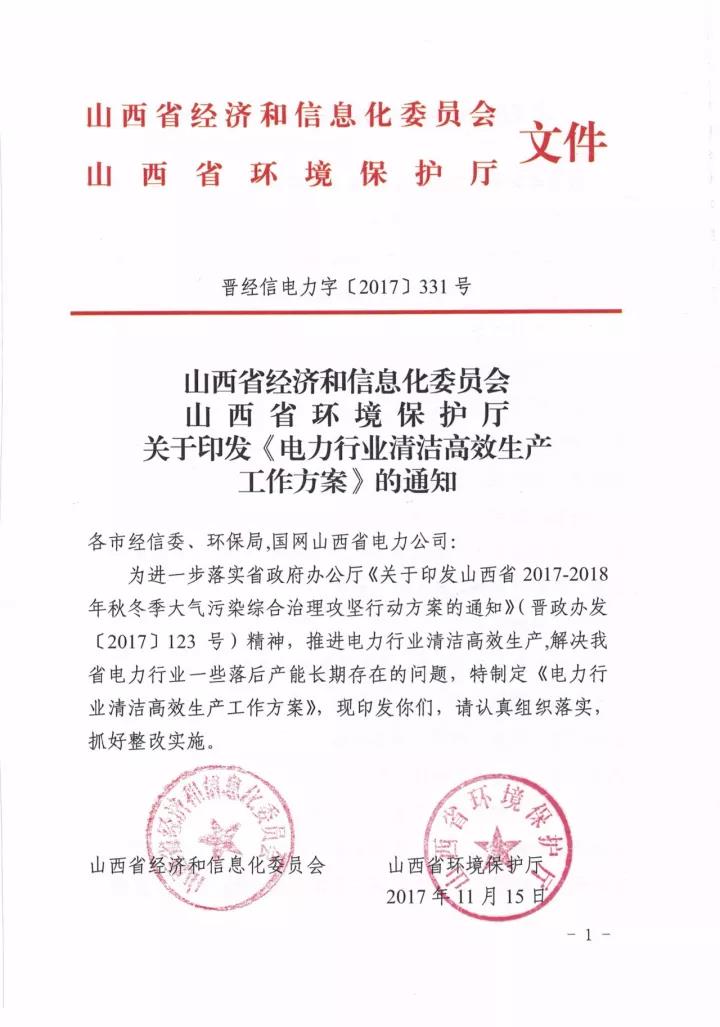 为进一步落实省政府办公厅《关于印发山西省2017-2018年秋冬季大气污染综合治理攻坚行动方案的通知》(晋政办发〔2017〕123号)精神,推进电力行业清洁高效生产,解决我省电力行业一些落后产能长期存在的问题,特制定《电力行业清洁高效生产工作方案》,现印发你们,请认真组织落实,抓好整改实施。