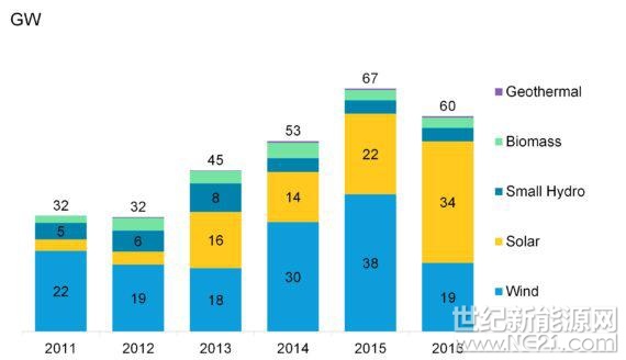 2016年,太阳能占报告中国家新增电力容量的份额为19%,相比2015年的10.6%有所增长。BNEF指出,2016年部署的太阳能容量将足以满足印度4500万户家庭或是秘鲁或尼日利亚所有家庭的的年度总电力需求。