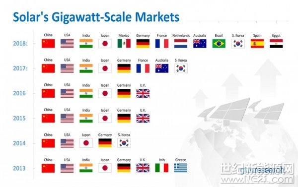 . 2017年,中国、美国、印度、日本、德国、法国、澳大利亚和韩国,这8个国家将部署1吉瓦以上的太阳能容量,而明年太阳能容量部署超1吉瓦的国家将达到13个。 GTM Research表示,2018年欧洲市场将经历复兴,需求增长35%。西班牙将处在积极趋势的最前沿,因为其太阳能市场预计将从2017年的40兆瓦猛增至1.4吉瓦。西班牙最近的技术中立拍卖已授予3.9吉瓦光伏容量。 GTM Research高级太阳能分析师Tom Heggarty表示,欧洲市场正在进入一个可持续增长的阶段,因为它正在走向无补贴市场,而不再受上网电价补贴繁荣和萧条周期的驱动。 另外,2017年至2018年,埃及太阳能容量预计将增长五倍,达到1.4吉瓦。目前,该国许多项目已经融资到位,这得益于由欧洲复兴开发银行(EBRD)和国际金融公司(IFC)牵头的国际开发银行融资联盟的贷款。 明年预计拉丁美洲也将出现强劲增长。2018年拉丁美洲的太阳能需求将增加一倍多,由墨西哥和巴西领导。 GTM Research指出,总体而言,2017年至2022年间,全球将部署606吉瓦太阳能容量。