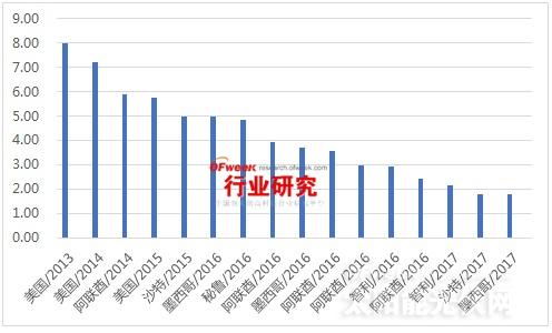 图表1:历年光伏最低报价记录统计(单位:美分/千瓦时)