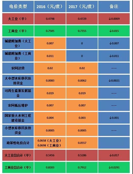 从表中可以看出,2017年的文件里已取消城建附加费,其余政策性电费要么保持不变,要么略有降低,其中,大工业及工商业度电电费都有降低。