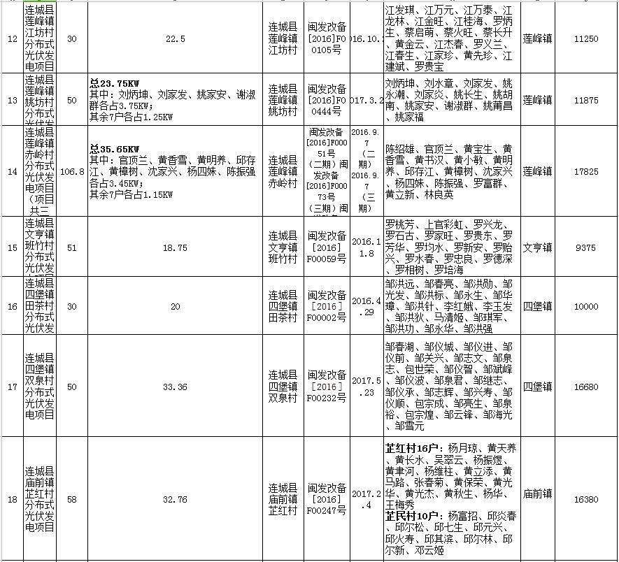 索比光伏网讯:根据《龙岩市人民政府办公室关于印发龙岩市光伏产业扶贫奖补办法的通知》(龙政办〔2016〕286号)精神,各乡镇对符合申报条件的光伏项目的申报材料进行初审,5月25日至6月1日、12月1日发改局、财政局、经信科技局、农业局(扶贫办)、供电公司等单位组织相关人员对申报项目进行现场核查、认定。现将核查、认定情况予以公示,公示日期为2017年12月11日至2017年12月15日止。