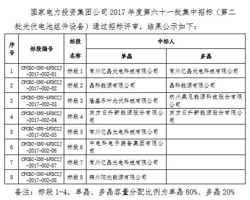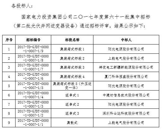 索比光伏网讯:12月8日,国家电投公示2017度第六十一批集中招标第二批光伏组件、并网逆变器中标结果。
