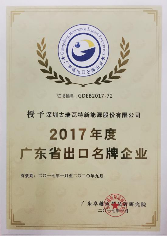 日前,广东省卓越质量品牌研究院公布了2017年度广东省出口名牌企业名单,古瑞瓦特以匠心精神深耕光伏行业,用品质和创新不断获得消费者和市场的认可,凭借全球经营中获得的丰富实践,被评为“2017年度广东省出口名牌企业”。