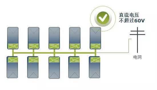 微型逆变器微型逆变器为全并联电路设计,组件之间不再有电压叠加,直流电压小于40伏,彻底解决了由于高压直流拉弧引起火灾的风险,用户可以放心使用,再也不用担心屋顶上会有一个高压电站。