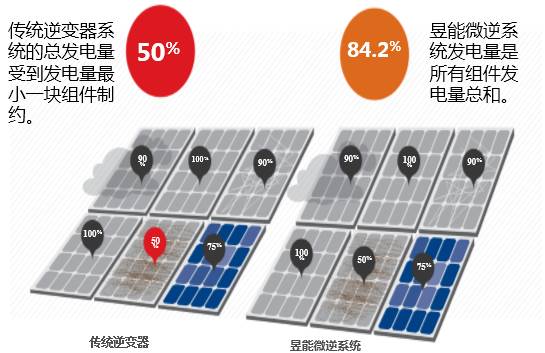 微型逆变器光伏系统为全并联设计电路,每块组件都具有独立MPPT,可以实现最大功率输出,使得阴影、灰尘、树叶对电池板的部分遮挡,不再有短板效应,消除了组件朝向和角度不同而造成的失配问题,大大提高了发电量,总体能多产生5%~25%的发电量。且系统弱光性好,每天5点左右即可开始工作,甚至在阴天也能发电,自然发电量远高于同等条件下的串型系统。