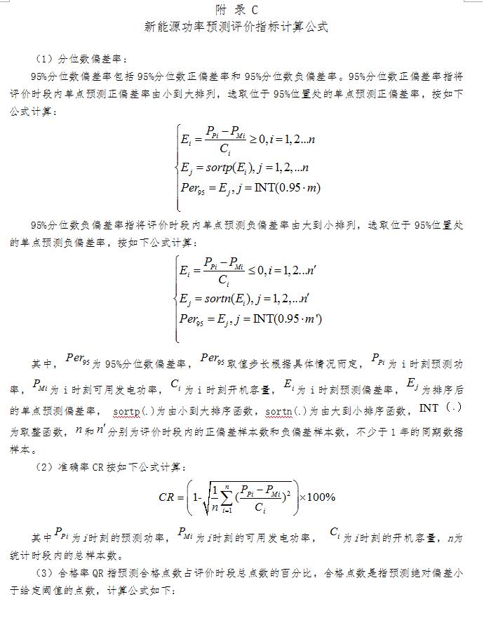 第五十九条 新能源场(站)预测预报指标包括日前预测准确率、合格率、上报率、95%分位数偏差率、平均绝对误差率、极大误差率。月预测预报准确率高于80%、合格率高于85%、上报率高于90%,其中一项不达标时对应本月考评项得分为0。对应得分采用半梯模型计算。