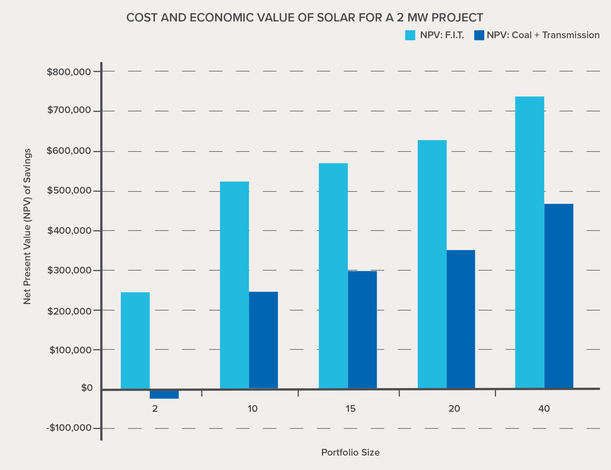 图2展示了一个2兆瓦太阳能购电协议在整个合同期限内(25年)的净现值与以下二者的对比:(a)Tri-State电力公司115号政策下的上网电价补贴;(b)煤电生产现金成本加上可避免的输电成本。