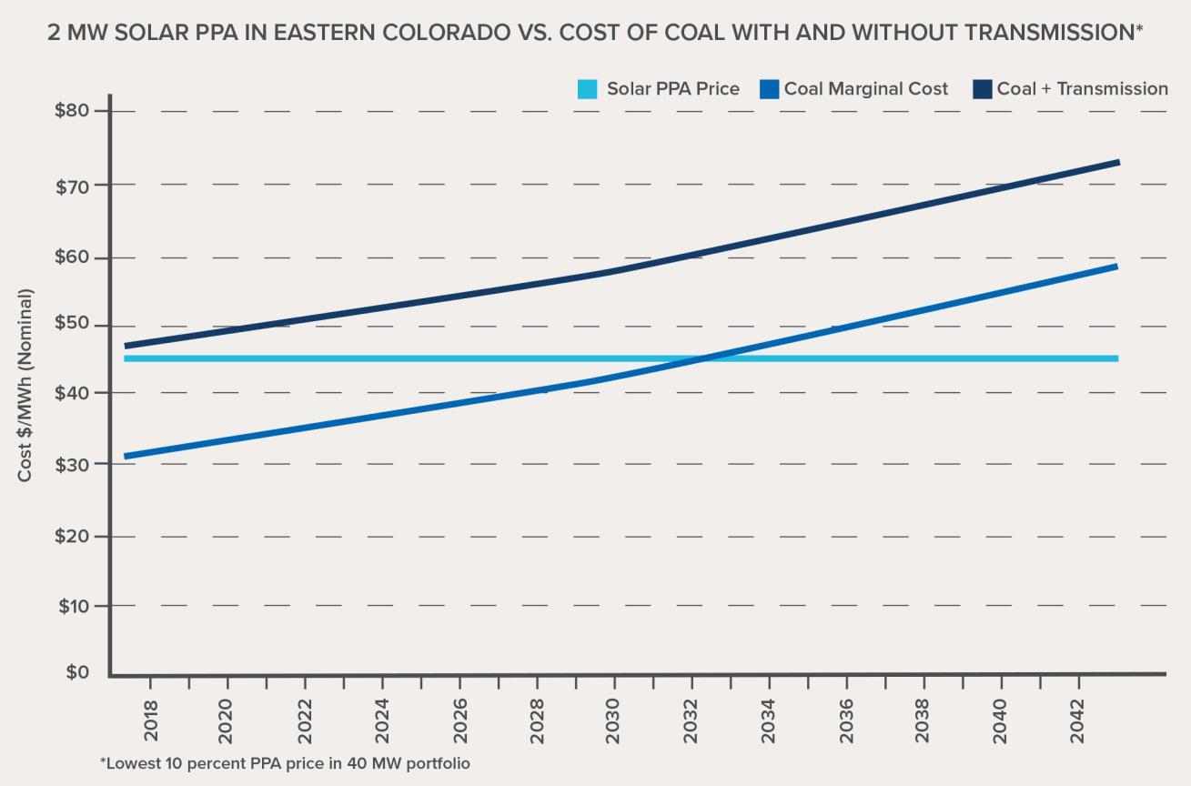 图3:科罗拉多州东部2兆瓦太阳能项目购电协议vs.包含/不包含输电成本的煤电发电成本