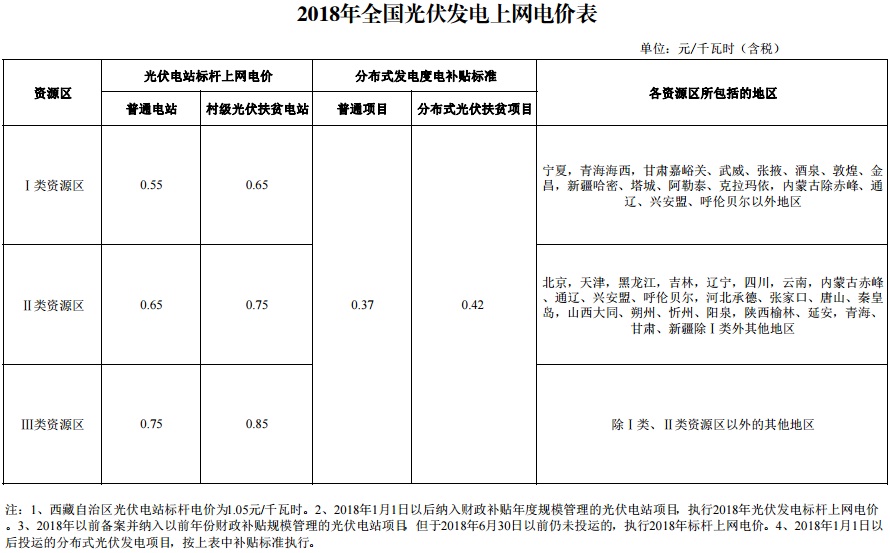 一、根据当前光伏产业技术进步和成本降低情况,降低2018年1月1日之后投运的光伏电站标杆上网电价,Ⅰ类、Ⅱ类、Ⅲ类资源区标杆上网电价分别调整为每千瓦时0.55元、0.65元、0.75元(含税)。自2019年起,纳入财政补贴年度规模管理的光伏发电项目全部按投运时间执行对应的标杆电价。