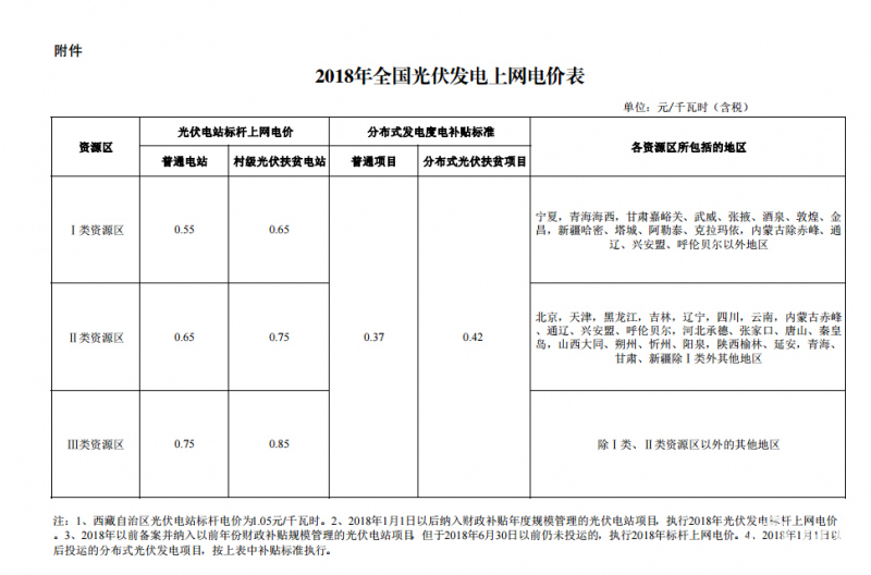 一、根据当前光伏产业技术进步和成本降低情况,降低2018年1月1日之后投运的光伏电站标杆上网电价,Ⅰ类、Ⅱ类、Ⅲ类资源区标杆上网电价分别调整为每千瓦时0.55元、0.65元、0.75元(含税)。自2019年起,纳入财政补贴年度规模管理的光伏发电项目全部按投运时间执行对应的标杆电价。