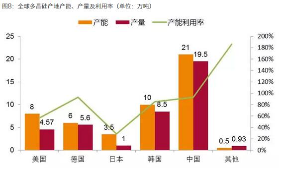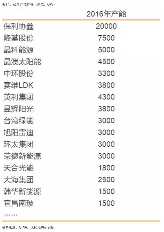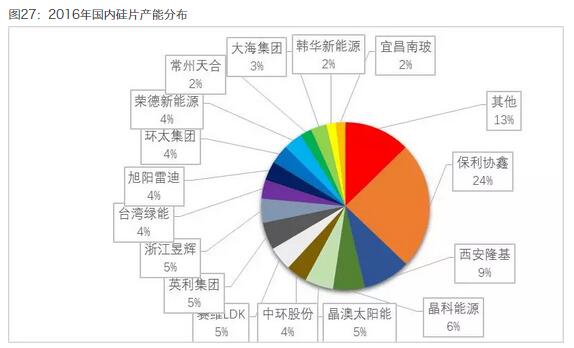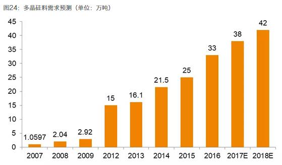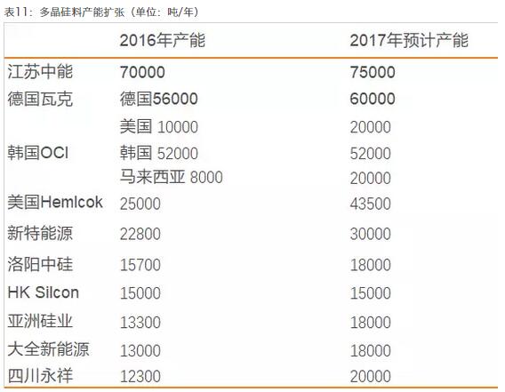 且按照近两年产能扩张比较大的厂商规划,2017年隆基股份、中环股份扩张产能超过15GW,国内硅片产能占比还有继续提升的趋势。所以,国内多晶硅料对硅料的需求还会继续提升。