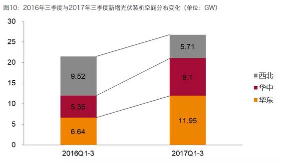 截止到今年三季度末,新增光伏装机数据可以看出来,结合消纳、优化布局的调整已经发力,新增光伏装机增速最快的是华东地区,2017年前三季度增速80%,华中地区增速70%,而西北地区新增装机出现下降。