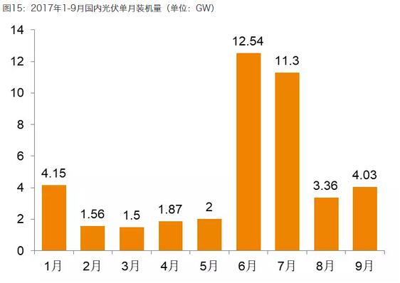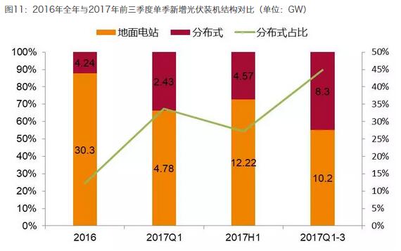 2017年前三季度分布式新增装机15.3GW,超过去年全年分布式光伏新增装机的3倍;地面电站新增装机27.3GW,增速开始放缓。