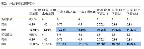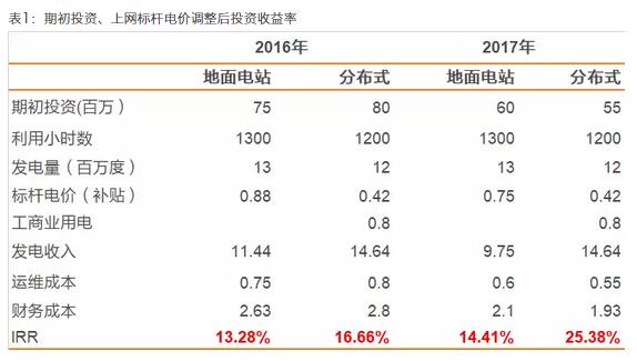 分布式补贴没有变化,期初投资成本大幅下降前提下,分布式项目投资收益率大增;地面电站期初投资下降、标杆电价下调后,也依然能保证电站投资收益率上升。
