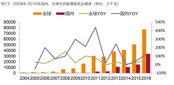 自2013年复苏,光伏国内、全球装机量年终数据超过预期已经多次,一方面是国内巨大的终端市场迅速崛起;另一方面是光伏全球市场正在去中心化,成熟稳健、快速增长、新兴潜力结合的多元化市场正在形成,光伏政策驱动的大起大落减少,真正向高成长性行业切换。