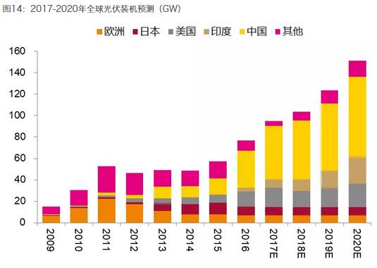 光伏系统装机成本目前每年超过10%的速度下降,越来越多的国家开始投资或准备投资开发光伏发电产业;在成熟市场,越来越多的应用模式开始有经济性。我们认为到2020年,国内依然是全球光伏应用的主要市场,分布式、光伏扶贫、领跑者三驾马车拉动国内需求启动第二波快速增长。欧洲、日本市场趋于稳定,美国市场由于今年透支了部分2018年的指标,将2018年或新增装机有所下降,但中长期来看,美国新增市场容量非常可观。