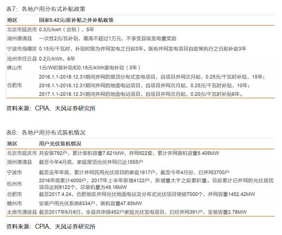 可以看出,2017年一季度分布式装机热情已经燃起;二季度由于“630”强装驱动,受标杆电价下调影响的地面电站面临抢装,导致单季地面电站占比上升;三季度单季分布式新增占比更加明显。如果说集中式地面电站是指标确定容量,那分布式就是市场力量驱动,在行业逐渐实现平价上网,摆脱指标、补贴限制的天花板之后,行业将打开、释放更大市场空间。