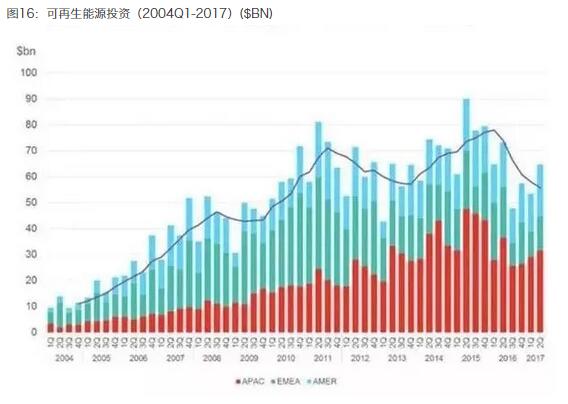 光伏行业已悄然发生变化,不再是昔日一个市场变动,全球行业伤筋动骨的年代,光伏行业2011年在欧洲达到顶峰,2017年也许在中国也达到顶峰,但是全球来看,行业投资近几年一直是向上的,因为新兴市场正在崛起。彭博新能源财经最新发布的二季度清洁能源投资数据,投资638亿创2016年二季度以来的新高,环比上升21%。这主要受益于阿联酋两大光伏项目20亿美元的投资;美国和中国投资相比上季度分别上涨51%和32%,墨西哥、澳大利亚和瑞典融资额急剧增加,埃及、阿根廷创历史新高。全球清洁能源迎来复苏。