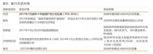 根据中国光伏行业协会的一组数据:目前新兴市场中,装机规模超过1GW的国家和地区有24个,超过10MW规模的国家和地区有112个,已经制定光伏政策目标的国家有176个。光伏系统装机成本快速下降,越来越多的国家和地区有条件开发光伏发电,新兴市场将是接下来全球光伏新增装机的主要动力之一。