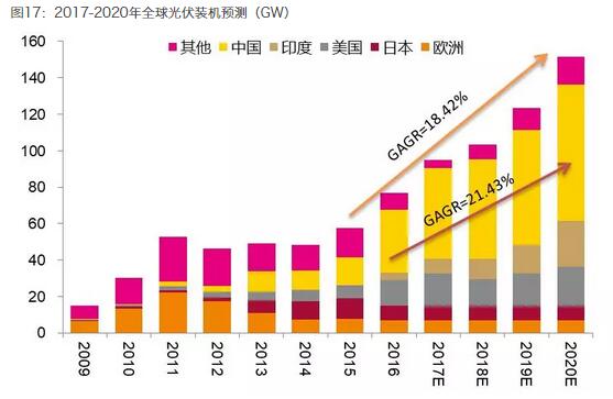 通过国内成熟、高增长及新型市场的剖析,我们认为全球光伏市场正在去中心化,一个市场的的波动或许对光伏产业链造成一些波动,但已经远不能造成寒冬式的冲击。行业成本下降速度超出预期,补贴和指标限额的天花板逐渐提高,越来越多的新兴市场开始投资光伏,行业正在逐渐摆脱补贴,依靠市场驱动力增长。预计到2020年,中国、美国、印度以及全球新增装机将达到75GW、22GW、25GW、151GW;国内复合增长率达到21.43%,全球复合增长率达到18.42%。