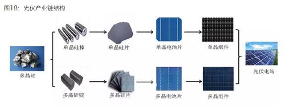 光伏产业链包括“多晶硅料-硅片-电池片-组件-电站终端”,其中多晶硅料、硅片、电池、组件属于制造环节,电站终端投资运营属于下游应用环节。国内最早进入的环节是组件代工,目前国内企业参与已经从最下游的组件,延伸到上游。最早期国内企业做组件,后来做电池,现在慢慢把附加值低的组装环节转移到马来西亚、印尼、越南等国家。