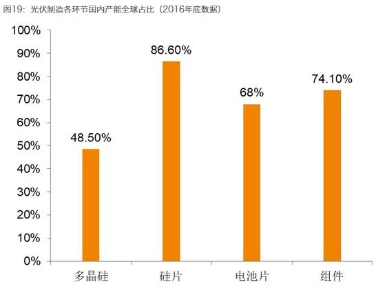 目前光伏制造已经全产业链实现国产化,并且引领全球的新技术与总产能,硅片、电池、组件国内产能已经占据全球产能一大半。多晶硅、硅片、电池片、组件产能分别占全球产能48.5%、86.5%、68%、74.1%,只有多晶硅料环节产能不足全球产能一半。
