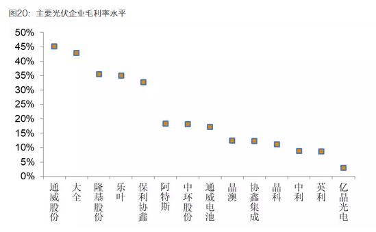 根据最新企业公告的毛利率统计,如下图所示,毛利率水平最高的通威、大全,是多晶硅环节;隆基股份、保利协鑫次之,位于硅片环节;阿特斯、通威电池较前两个环节下降一部分,是电池环节;协鑫集成、晶澳、晶科、英利毛利率更低一些,主要位于组件环节,或者垂直产业一体化结构且出售组件终端产品。