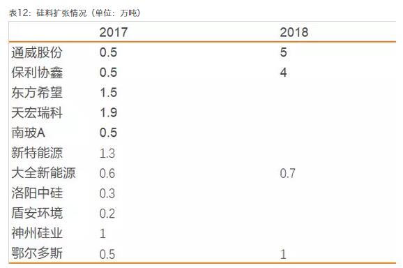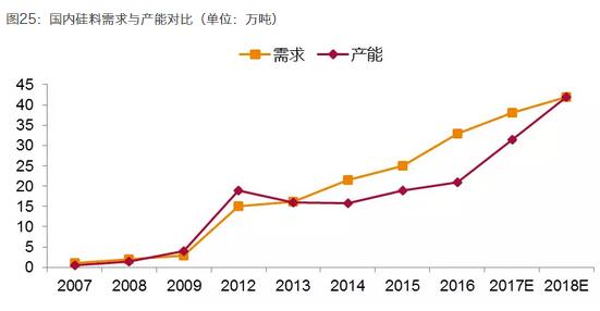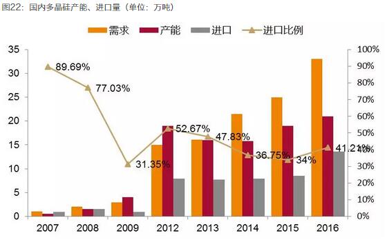2016年底国内硅料产能21万吨,预计2017年底产能将达到31万吨,2018年底将超过40万吨,国内勉强可以实现自给自足,但由于部分不足万吨产能的小厂将面临淘汰,预计2019年前后,多晶硅依然需要进口。
