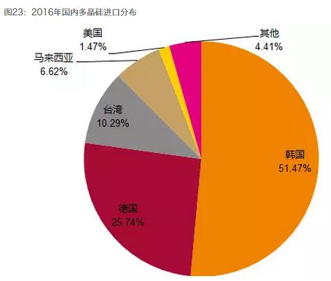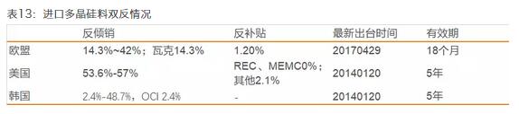 国外多晶硅厂商多为大型化工厂,掌握先进的提纯工艺,国内厂商前几年并没有成本优势。2014年开始国内对来自美国、韩国、欧盟的多晶硅征收双反税,限制进口,但是主要进口企业瓦克(14.3%)、OCI(2.4%),尤其是韩国征税水平较低,过去两年,国内硅料需求大幅增长,进口量依赖依然很高。