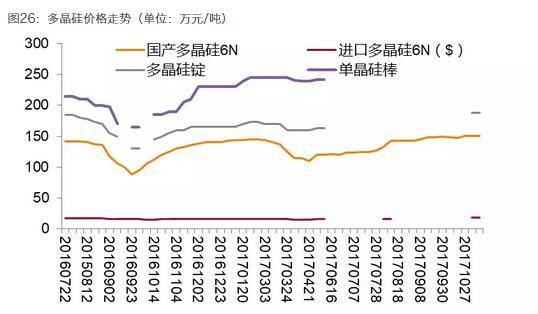 上半年国内多晶硅均价为12.66万/吨,一季度价格上升到14.27万/吨后出现下滑,5月份受国内抢装需求和美国201法案调查推动的囤逐渐行动推动,加之三季度部分国内厂商检修,环保督查影响生产,从5月份多晶硅价格一路上涨,截止最近交易价格位于15万~15.5万/吨之间。