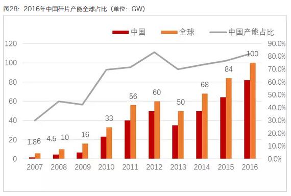 国内光伏市场无疑已经成为全球最大的下游应用市场,自2013年起已经连续四年全球下游市场需求第一,累计装机量也连续两年全球第一。2016年国内新增装机34GW,全球新增装机77GW,国内市场占有率超过44%,今年预计国内装机有望超过50GW,全球预计装机90-100GW,国内下游市场占全球比例将超过一半。