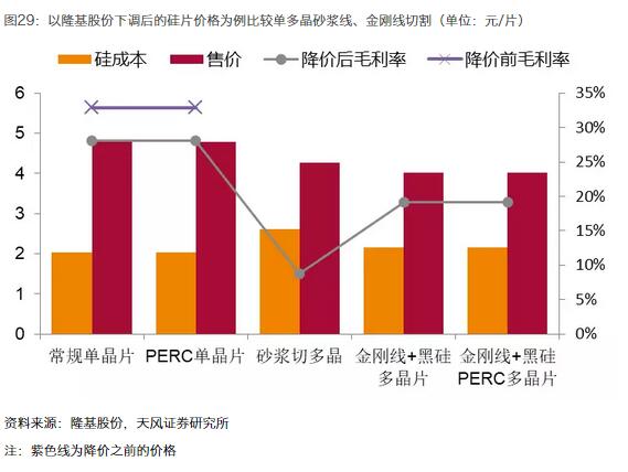 第二个值得关注的是硅片环节。单多晶是在硅片环节区分,由于单晶PERC+金刚线切割,实现成本下降和效率的提升,隆基目前硅片非硅成本已经降到1.5-1.6元/片,隆基乐叶单晶PERC电池转换率最高水平已经达到23.26%。多晶PERC效率提升小于单晶提升幅度,且多晶使用金刚线切割存在表面光反射问题,需要叠加黑硅技术。因此,目前单晶PERC+金刚线替代优势非常明显,且毛利率水平高于多晶,短期内替代趋势明确。