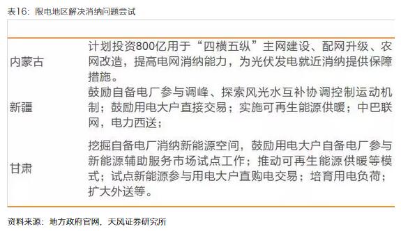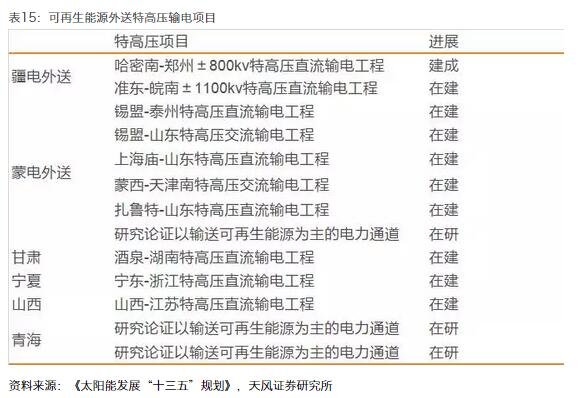 2016年12月,国家能源局发布《太阳能利用“十三五”规划》,谈及解决限电地区消纳问题,一方面要在靠近特高压外送基地的地区建设再生能源发电基站;另一方面,列示了在建和建设可行性在研的特高压项目,其中新疆、内蒙古、甘肃、宁夏、山西将有多条特高压陆续投运,青海、内蒙将有多条特高压开建,将缓解西北地区电力外送能力不足问题。