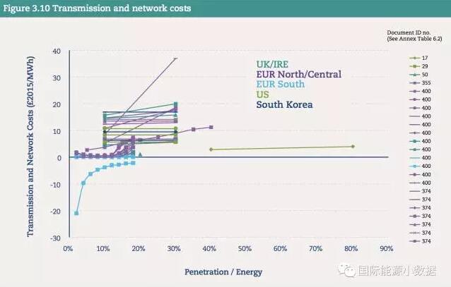 第三项要考虑的系统成本因素是因为吸纳间歇性可再生能源电网所需要的“加固”和“灵活性”改造,此项成本约在5-20英镑/兆瓦时(合人民币0.04-0.17元/千瓦时)。越是不灵活的电网,改造成本就越高。但是由于电网本身需要不断的技术改造,并和周边地区或国家联网,所以电网改造的成本并不应该全部算在可再生能源头上。