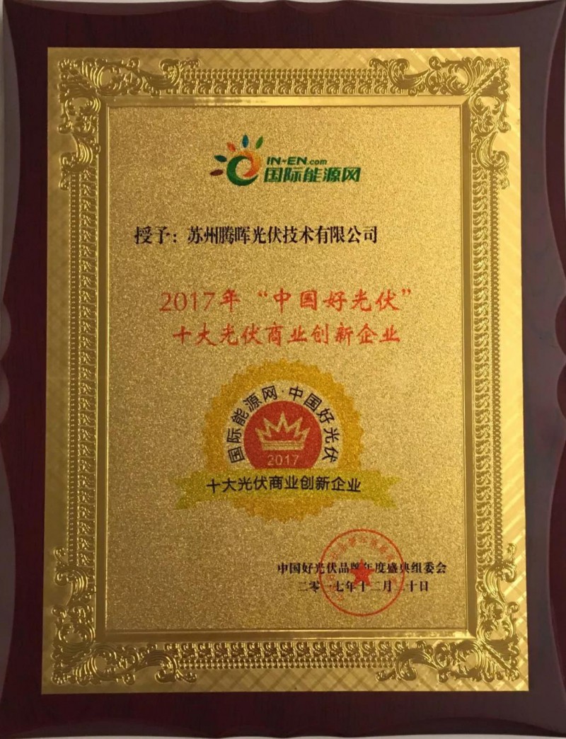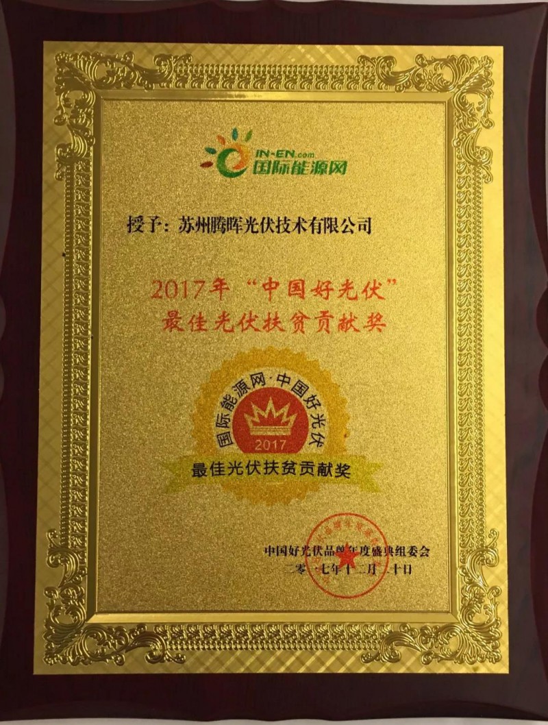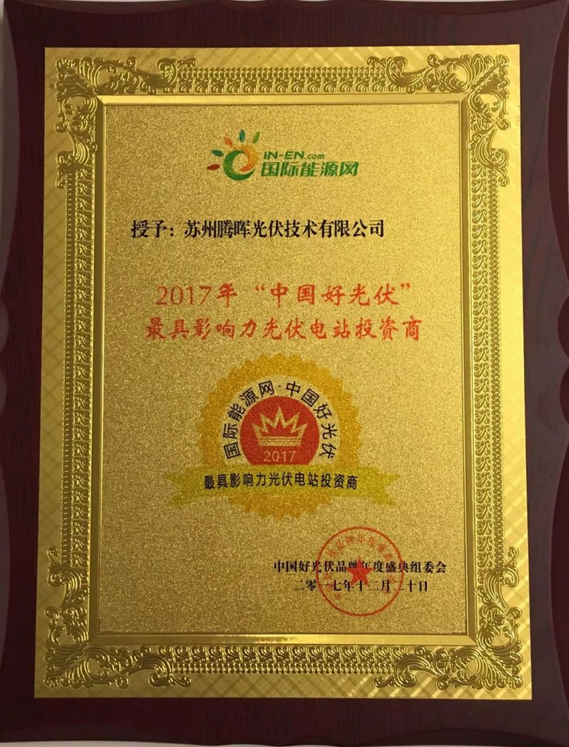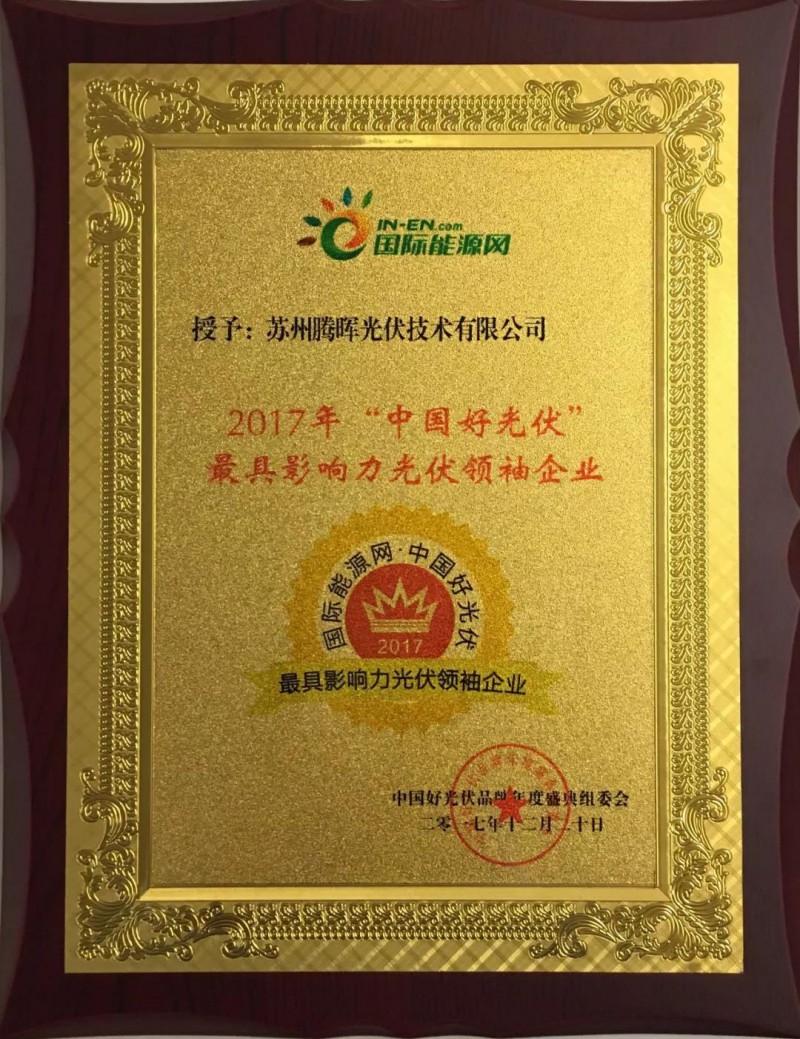 12月20日,“第二届中国光伏产业发展与创新应用论坛暨2017中国好光伏品牌年度盛典”,在北京盛大召开。本次会议旨在集中展示与总结2017年光伏产业的先进技术、创新模式,同时也为将来光伏行业的发展指明前行方向。苏州腾晖光伏技术有限公司(以下简称“腾晖光伏”)凭借在过去一年中的出色表现一举夺得“最具影响力光伏领袖企业”、“十大光伏商业创新企业”、“最具影响力光伏电站投资商”、“最佳光伏扶贫贡献奖”四项大奖,成为本届年度盛典最大赢家之一。