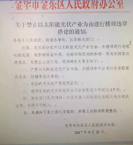 2017年9月,浙江金华金东区发文禁止家庭光伏使用蓝色光伏组件