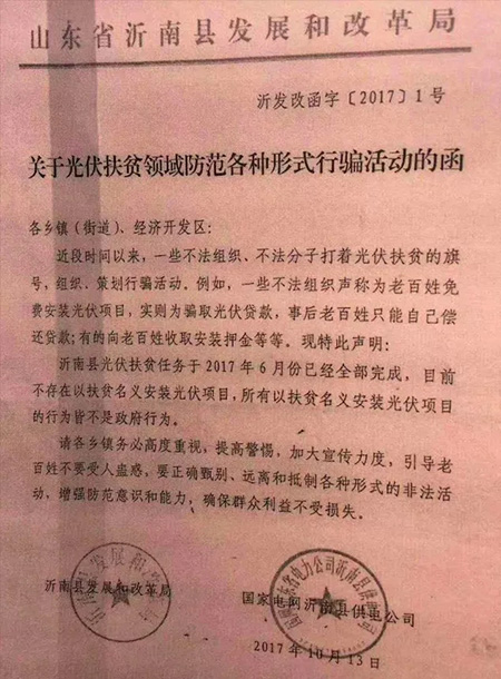 2017年10月,山东省沂南县发文,警惕光伏贷骗局
