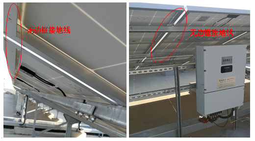 光伏组件铝边框没有用专门的黄绿线接地,仅通过铝框跟支架接触间接接地,接地电阻大且不可靠,