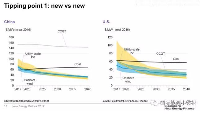 第一个临界点是:在没有补贴的情况下,新建风电、光伏电站发电成本可与新建煤电、天然气电站竞争。在目前的市场条件下,在很多国家已经接近这一临界点。在德国,新建陆上风电的发电成本已经低于煤电、天然气发电;在中国,目前煤电成本在各类电源中依然是最低的,但是预期2019年陆上风电成本将低于煤电、2021年光伏成本也将低于煤电;在美国,天然气发电是各类电源中成本最低的,但预计2022-2023年风电、光伏成本均将低于天然气发电;在印度,预计2020年起新建光伏将在全国范围内低于煤电。