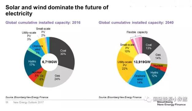 根据BNEF的预测,2040年太阳能光伏将成为主导能源之一,占全球发电总装机的32%;风电14%、水电12%、煤电14%、天然气13%、核电3%。