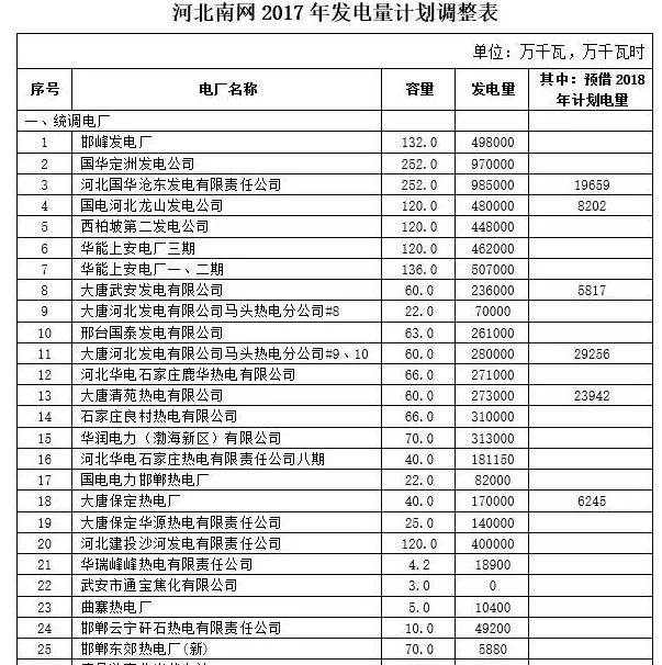 为确保电力供需平衡,居民供热需求,根据国家发展改革委关于迎峰度冬能源综合保障问题会议精神、保障迎峰度冬能源供应确保群众温暖过冬电视电话会议精神,在对全年电力需求和电力生产完成情况预测的基础上对各发电企业2017年发电量指标进行了调整(见附件),一是对各类型机组普调了基数发电量;二是调增基数小时后,发电量仍不能满足机组运行需求,再增加的发电量从2018年计划中借用。三是华北能监局或其它相关政府部门不允许开机的机组,按照11月底实际发电量下达计划。允许临时开机的机组,按照后期实际运行需求测算电量。四是新投机组按照投产时间,考虑试运行电量。