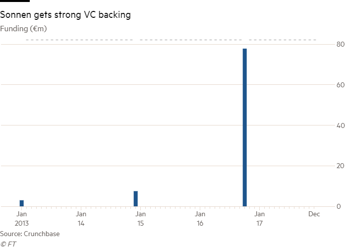 Sonnen是欧洲最大的可充电能源储存组生产商。2010年该公司成立时,其电池组的售价是2.5万欧元。如今,这些电池组的售价为5000欧元。