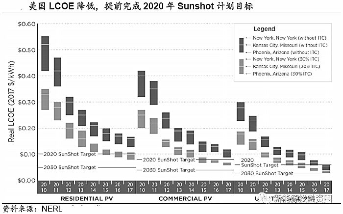 Sunshot 计划降低太阳能发电成本,政策计划推动光伏成本竞争优势:Sunshot 计划于2011 年推出,旨在降低太阳能发电成本。住宅式和商用式光伏发电成本分别实现了2020年计划的86%和89%,公用事业光伏发电已经提前三年达到目标,成本已经降到0.06美元/kWh。新Sunshot 计划2030 年公用事业光伏发电成本0.3 美元/kWh,商用0.04美元/kWh,住宅0.05 美元/kWh,将消减太阳能发电成本50%。太阳能光伏发电成本优势突出。