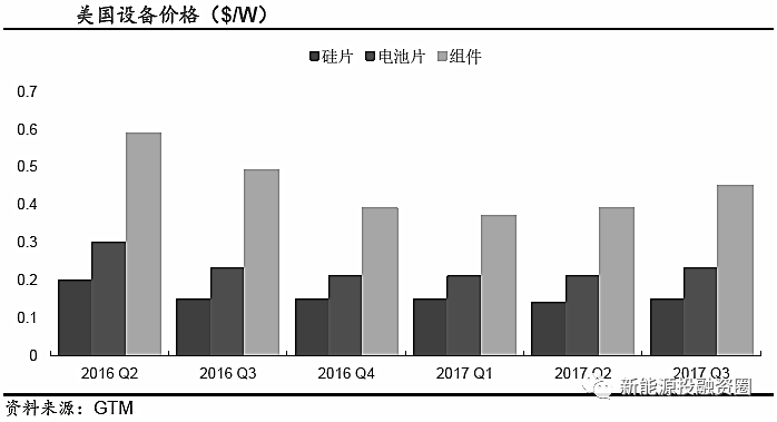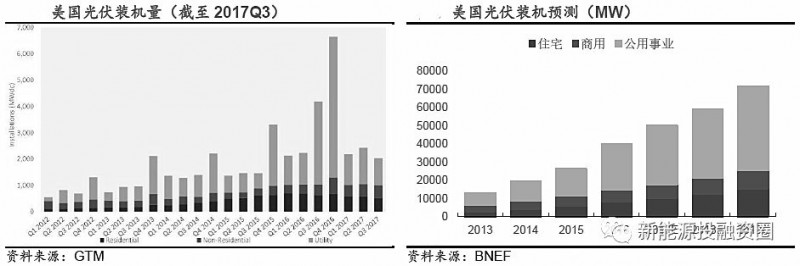 2017 年美国整体光伏装机表现良好:17 年第一季度的安装量为2044MWdc,比去年同期略有下滑,但考虑到16 年情况特殊,一季度整体可以。第二季度安装量为2387MWdc,比去年同比增加8%,创史上二季度安装量新高。三季度则为2031MWdc,低于去年,主要受政治不确定、设备价格上涨影响。总体来看,2017 美国光伏装机量保持稳定,预计2017 年全年安装量会超过8GWdc。