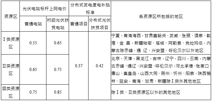 2018年1月1日之后投运的光伏电站,一类、二类、三类资源区标杆电价分别降低为每千瓦时0.55元、0.65元和0.75元,比2017年电价每千瓦时均下调0.1元。2018年1月1日之后投运的分布式光伏发电,对“自发自用、余电上网”模式,全电量补贴标准降低为每千瓦时0.37元,比现行补贴标准每千瓦时下调0.05元。