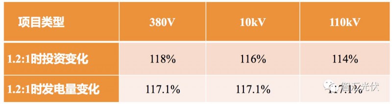 如果当采用光伏组件1.2:1超配时,统一按照2%弃光,线路损耗增加0.3%考虑发电量(未考虑运维成本增加),则增加的投资与增加的收益对比如下表。