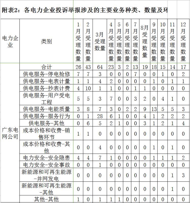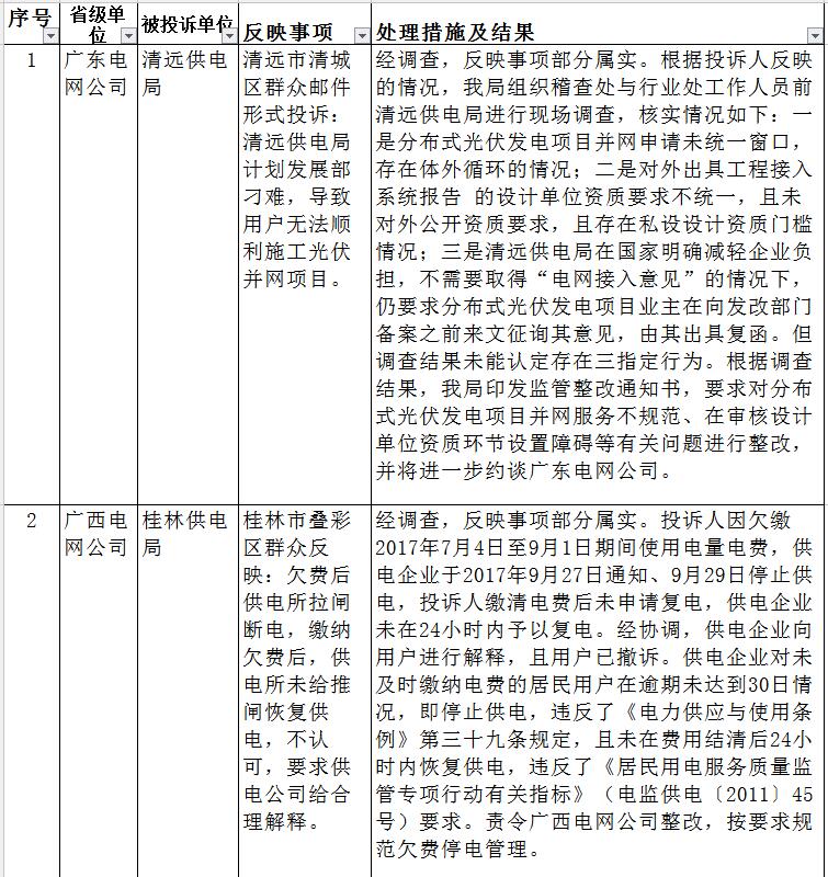 2.本月办结的投诉举报中发现以下问题:个别企业存在不根据实际情况回复报告的情形;未对用户报装的变压器按时接电;未按规定对光伏并网资料不符要求的用户出具书面告知书;工作人员服务态度差,95598等服务热线未及时处理用户反映问题等,以上问题请各供电企业引起重视并对照整改落实,我局将根据情况适时开展现场核查。