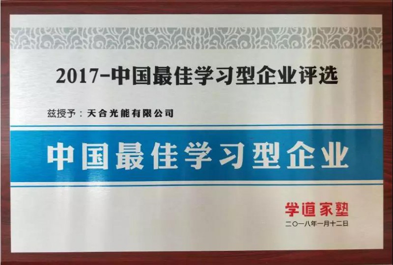 2018年 1月12日 ,“2017年度中国最佳学习型企业”颁奖典礼在广州隆重举行,天合光能从300多家企业中脱颖而出,荣获“2017中国最佳学习型企业”奖。天合光能凭借完善的人才培养机制与全面有效的培训赋能支持公司战略转型,打造开放、优质、专业的学习环境和赋能平台,在学习管理创新、机制创新、内容创新、技术创新等方面卓有成效。与天合光能同时获得此项大奖的还有,腾讯、万科、京东、中广核、兴业证券、中科曙光等14家知名标杆企业。